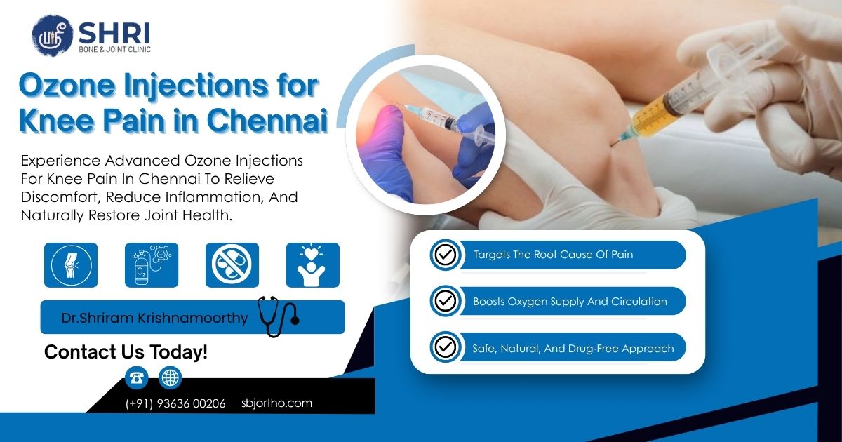 Dr. Shriram Krishnamoorthy, Orthopedic Specialist at Shri Bone & Joint Clinic, provides safe and precise ozone injection treatments tailored to each patient’s knee condition. When needed, he may also recommend alternative biologic therapies such as Regenerative Injection, Ozone Therapy, PRP Injection for knee pain, or advanced procedures like BMAC Injection, ensuring a complete evaluation under an experienced Orthopedic Specialist in Chennai.