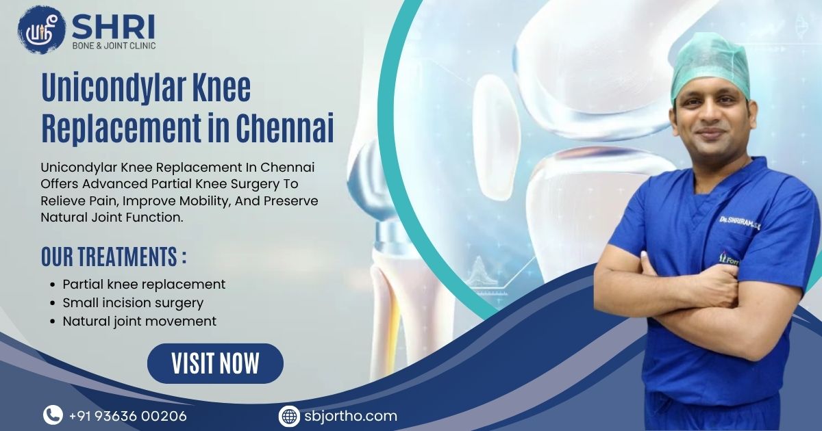 Shri Bone & Joint Clinic is recognized among the best hospitals for Unicondylar Knee Replacement in Chennai, known for precision surgery and personalized rehabilitation. The hospital features expert Orthopedic Specialists in Chennai who evaluate each case thoroughly to decide whether partial or total replacement suits the patient.