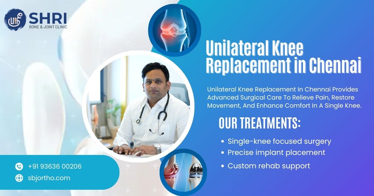 Shri Bone & Joint Clinic is considered one of the best hospitals for Unilateral Knee Replacement in Chennai, offering state-of-the-art orthopedic care. The clinic features experienced Orthopedic Specialists in Chennai who specialize in both single and double knee replacements.
